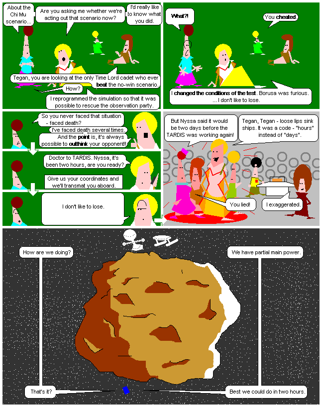 | In my cartooning class at the American Academy of Art in 1986-7, one assignment was a page of a comic book. This is what I did for that assignment, reenvisioned in triangles. (I still have the original, a little the worse for moves. It's poster-size and won't fit in the 8.5x11 scanner or I'd print it here.) I explained to the instructor that it was a scene from STAR TREK II if STAR TREK II had been a DOCTOR WHO story instead, and his only comment was, "That doesn't defy the format of DOCTOR WHO, does it? I mean, there isn't one villain who's in every episode?" |